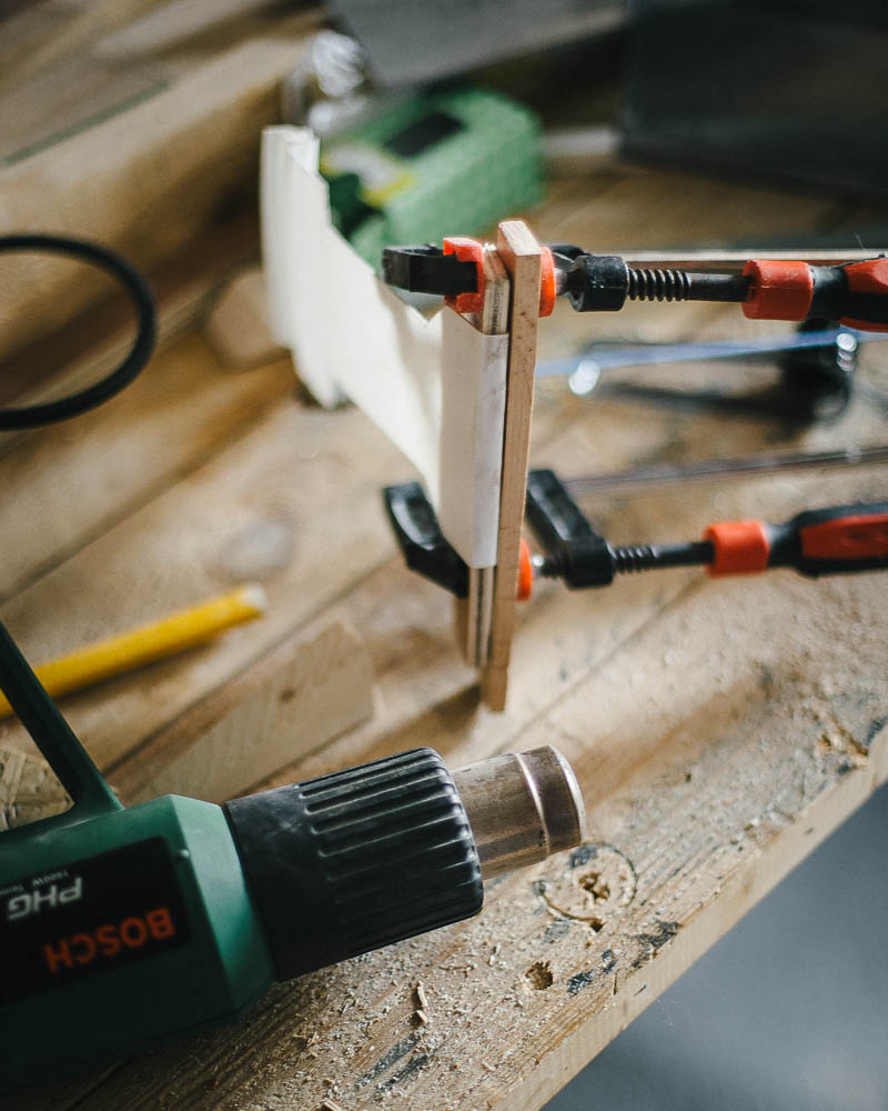 • Heat up the plastic using your heat source and carefully bend it around the wood “mold”