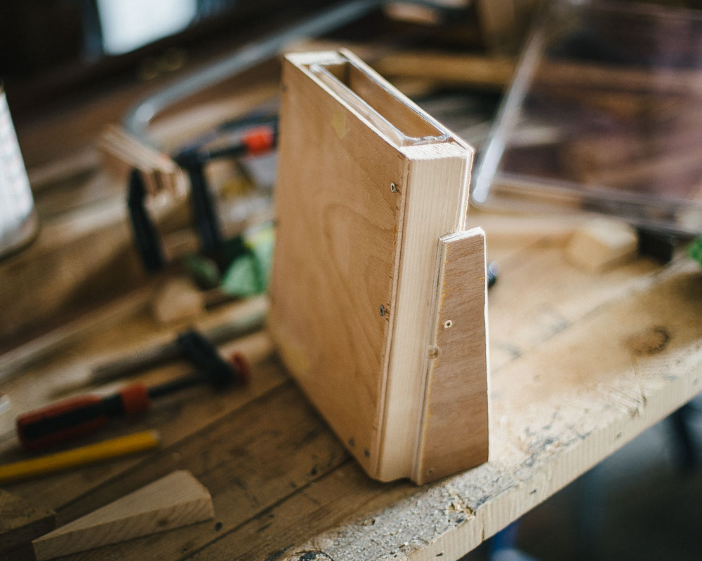 • Use the short screws to affix two horizontal pieces of wood to the vertical bits (see the photo of the finished think at the beginning of the article).